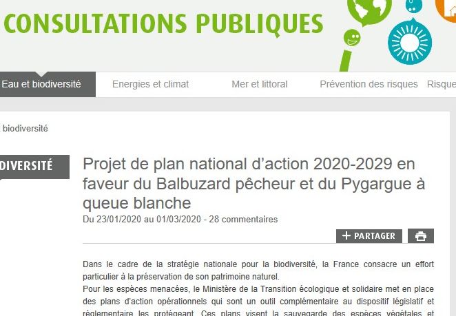 1) Nous vous invitons à déposer votre avis contre le plan national de protection du Balbuzard pêcheur et du Pygargue à queue blanche.